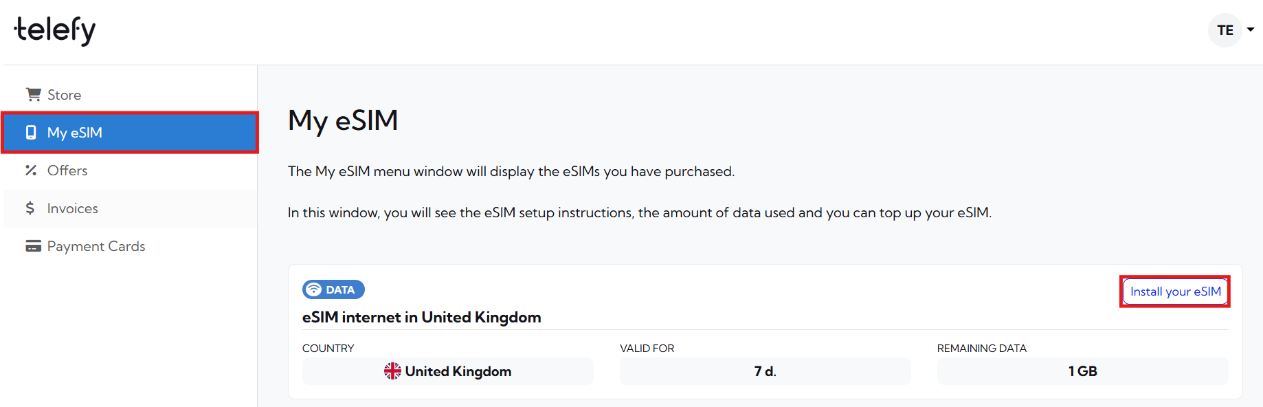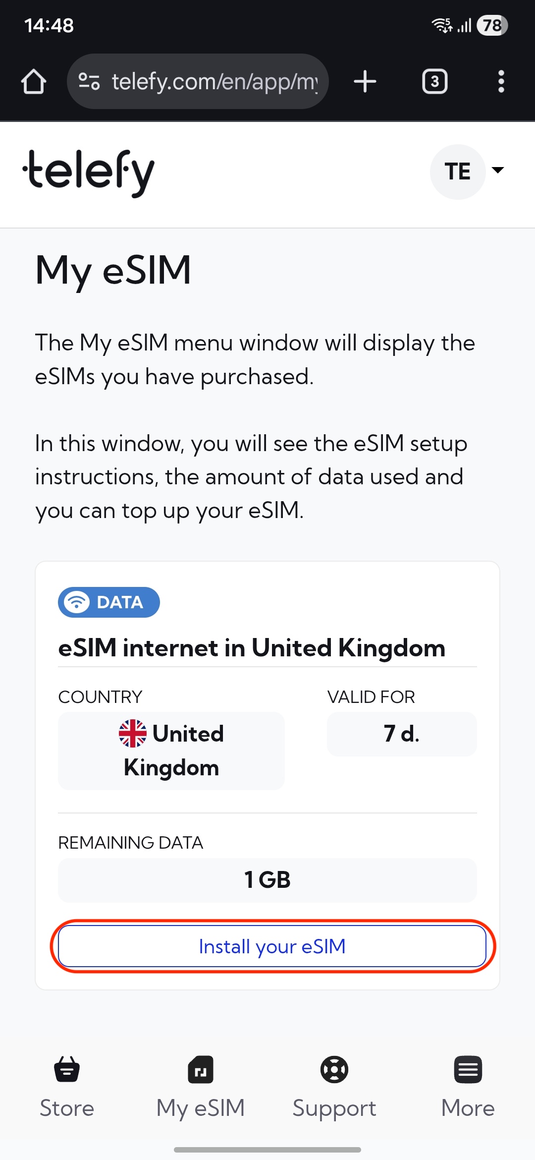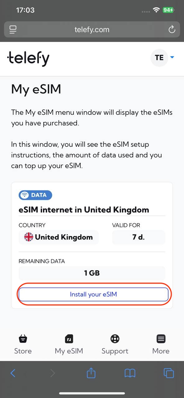 1. Log in to your Telefy account: Log in to your account and tap on "Install your eSIM" in "My eSIM" tab.