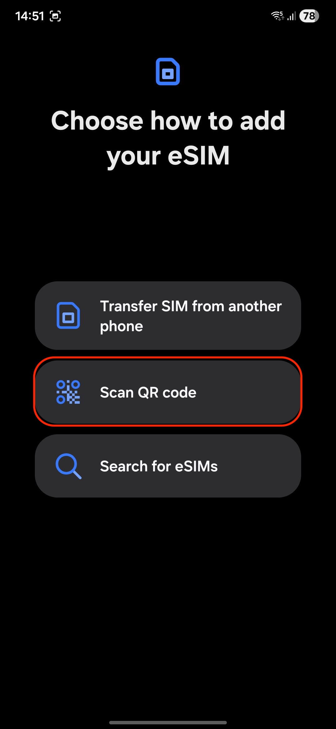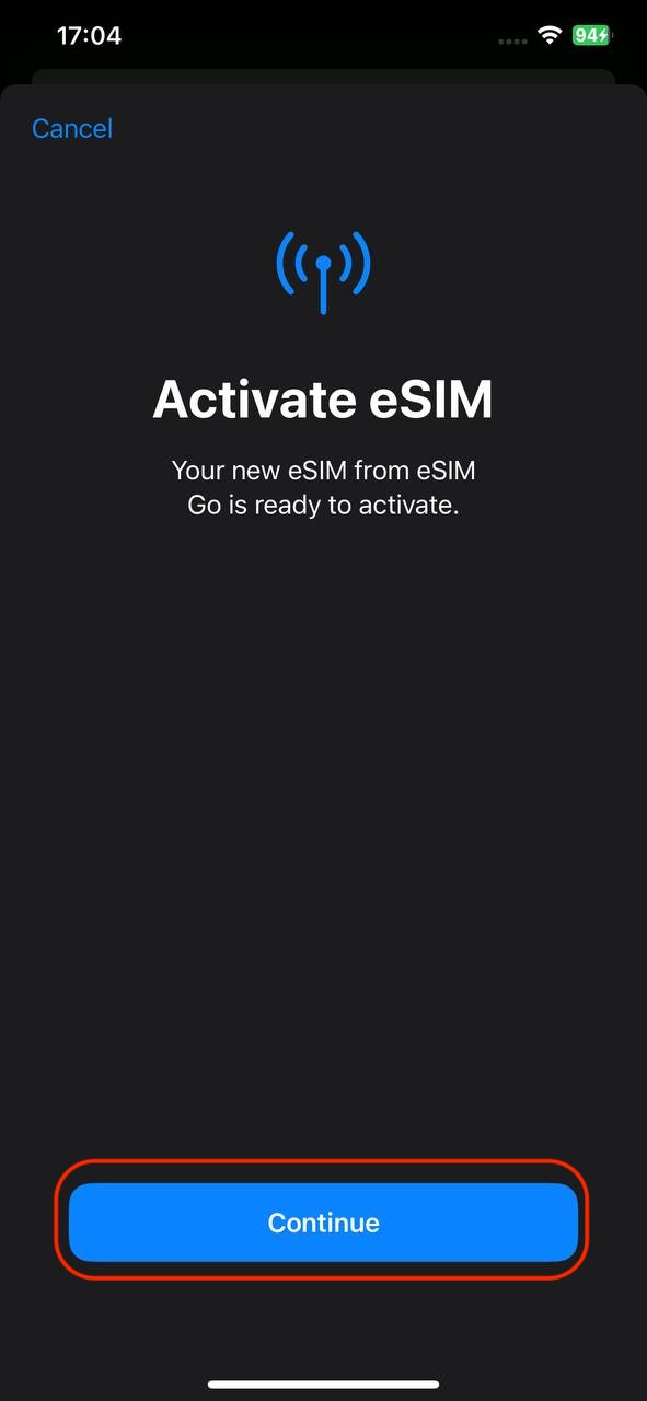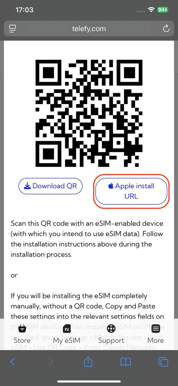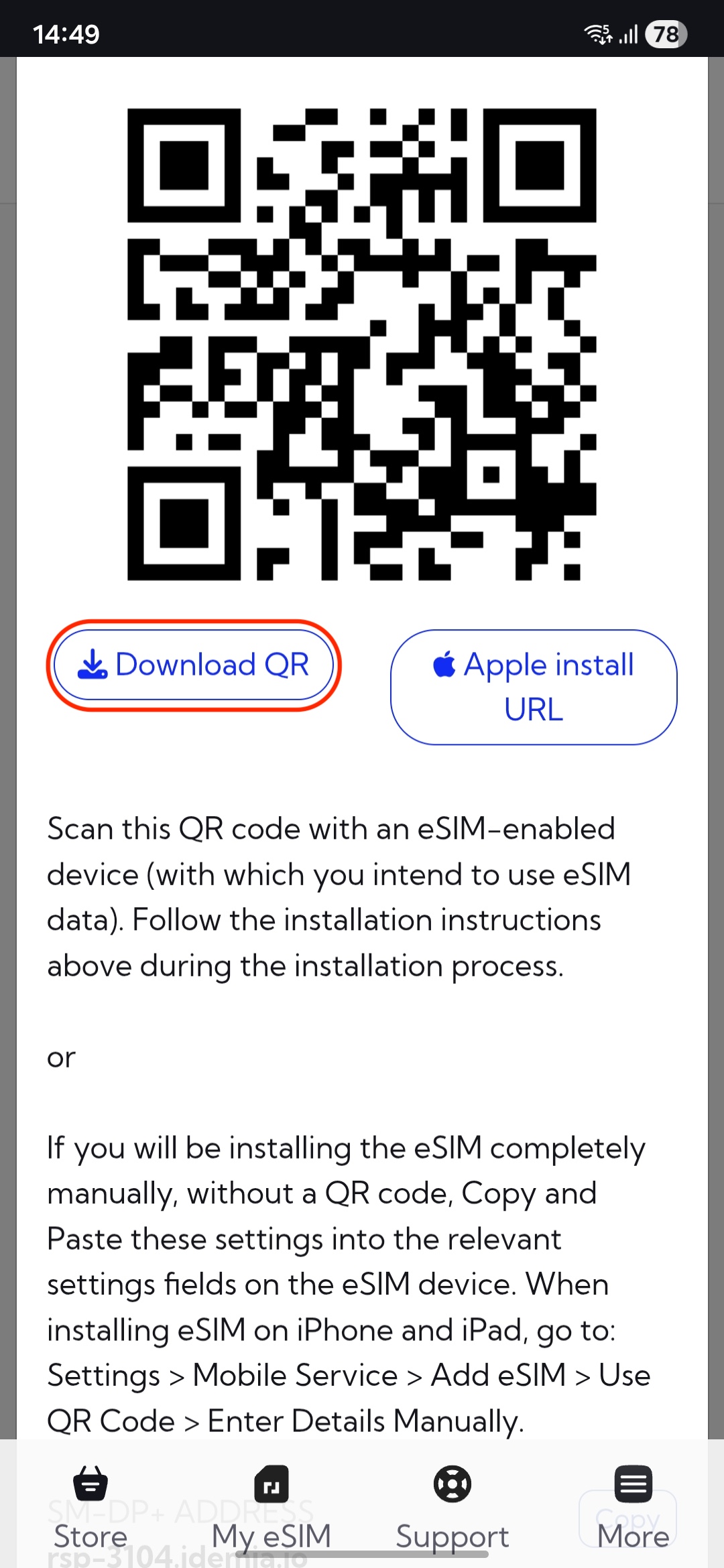 You will be presented with a QR code that you need to scan in order to initiate the installation process. You can scan it with your phone camera or follow the steps below to install the eSIM: