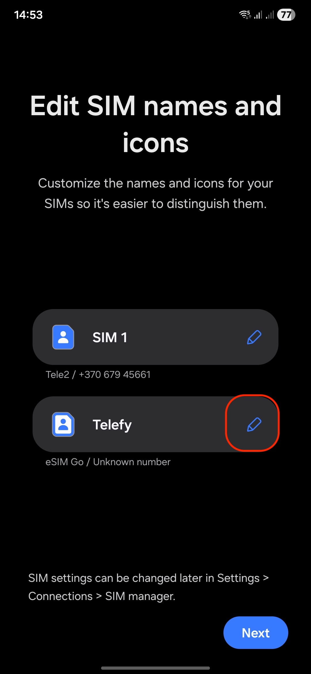 8. Follow Prompts: Complete the setup by following any on-screen instructions. You can rename the eSIM profile by taping on the edit button.